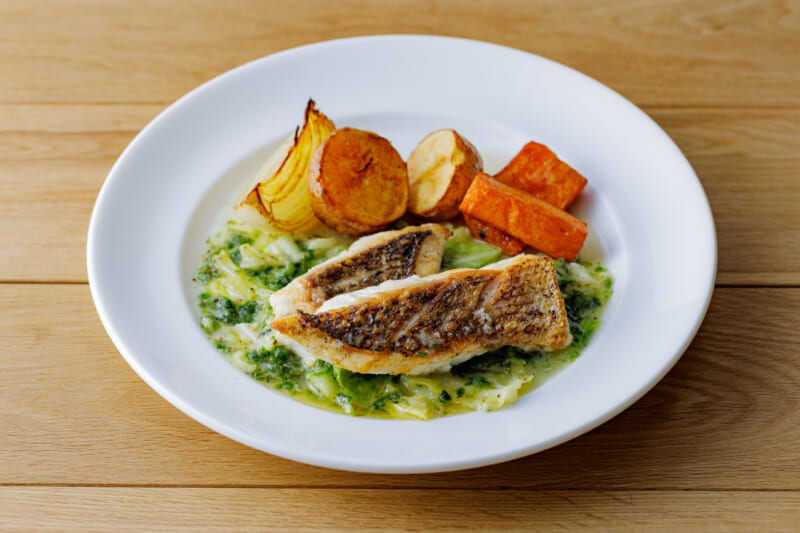 季節の魚料理は真鯛のムニエルをご用意しました。キャベツの甘みとあさりの出汁、